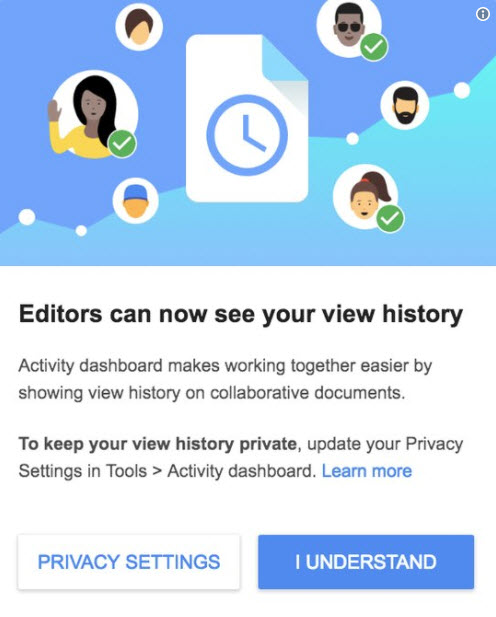 ドキュメントごとに閲覧履歴の有効/無効を設定することも勿論可能です。設定を変更したいドキュメントを開いた状態で、アクティビティダッシュボードへ行き、プライバシー設定を開き、そこで閲覧履歴の表示を無効にすればよいだけです。