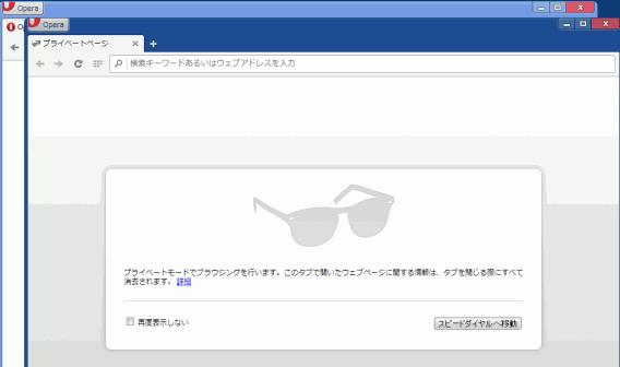 プライベートモード時のウィンドウ枠の色が濃くなりました。これによってプライベートモードのウィンドウと通常のウィンドウを明確に見分けることができます。プライベートモードでは枠の色が濃いだけでなく、タブに【サングラス】のアイコンが表示されています。以前からMacOSXでは対応されていましたが、今回のバージョンアップでWindowsでも同様のカラーに変更されました。