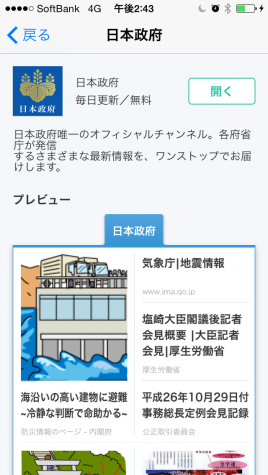 電波が悪い所でも読めるニュースサービスとして人気のある無料アプリ「SmartNews」が11月4日に新コンテンツチャンネル「日本政府チャンネル」を提供開始しました。新チャンネルは内閣官房との協力により実現し、政府の各Webサイトで配信されている情報を集約し1ヶ所でチェックできるようになります。