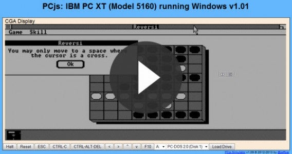 今日の見方では、そのような Windows の姿は想像できません。今日 Windows 1:01 を実行するには、Web ブラウザーと Java のみが必要です。James Friend による PC エミュレーター、 PCE.js を用いることにより、フロッピー ドライブと Windows 1:01 を含む IBM PC XT 一式の操作が可能です。Windows の初代バージョンで、できることはは多くありません。とはいっても、リバーシといった昔ながらのゲームは楽しめるかもしれません。