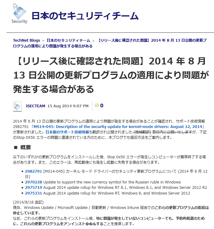 日本マイクロソフトが2014年8月13日に公開した Windows の更新プログラム(パッチ)に不具合があることが発表されました。この更新プログラムをインストールすると、「Stop 0x50 エラー」が発生し PC が異常終了したり起動に失敗したりする恐れがあるとのこと。