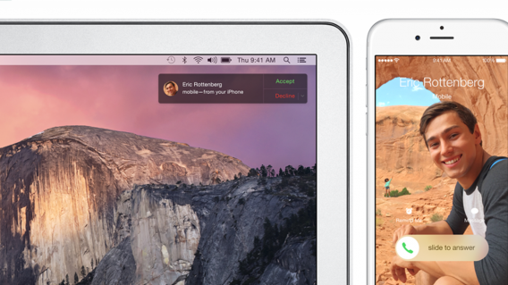 iOS 8とは見た目が似ているだけでなく「Continuity」機能によって連携し、Macの作業をiOS端末で引き継ぐことができます。デバイス間での作業の引き継ぎは「Handoff」と呼ばれ、ロック画面のスワイプやドックからのクリックだけで実行可能です。例えば、iPhoneでスプレッドシートを編集しているときにiPadで作業を引き継いで同じ状態のスプレッドシートからシームレスに行うといった使い方が可能になります。10月20日にはContinuityを利用可能にするiOSアップデート、「iOS 8.1」がリリースされます。
